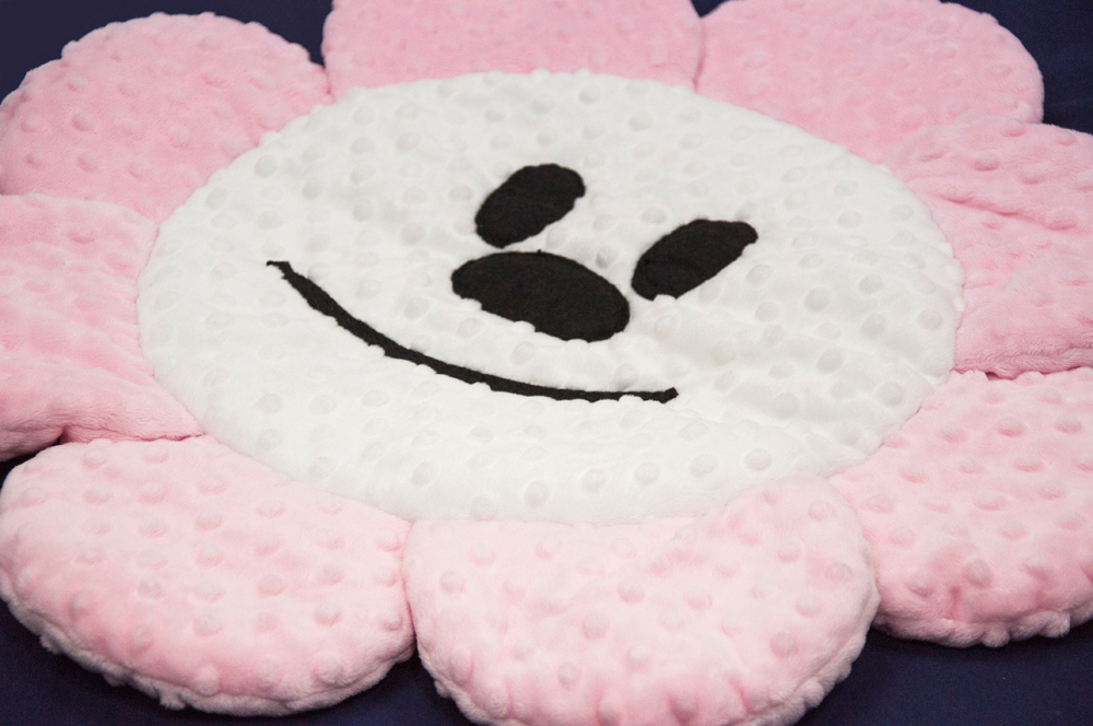Kołderka i poduszka KWIATEK wykonana jest z pięknej granatowej tkaniny bawełnianej sprowadzonej ze Stanów Zjednoczonych od Roberta Kaufmana. Dodatkowo ozdobione zostały miękkim, kolorowym i puszystym Minky z Shannon Fabrics, tworząc obraz uśmiechniętego kwiatka, którego płatki można trzymać.