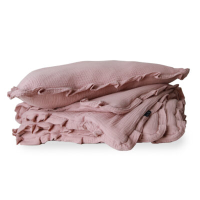 Przepiękny komplet pościeli SEPHIA ELEGANT z ozdobnymi falbankami, wykonany z delikatnego bawełnianego muślinu – to idealne rozwiązanie dla średniego dziecka.